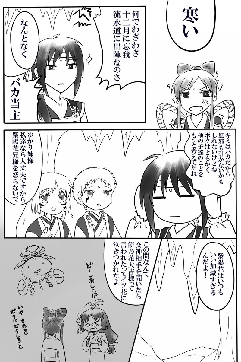 #俺屍週ドロ お題:【壊し屋】【交神の儀】【冬】 倭ノ宮(いのみや)家のマイペース食欲魔人当主・紫陽花とそのツッコミ兼世話係な壊し屋・ゆかりの凸凹コンビ何やかや漫画です。この後めちゃくちゃ交神した