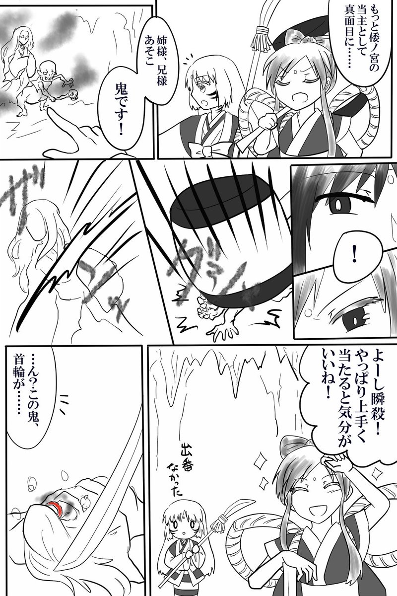 6 21 #俺屍週ドロ お題:【壊し屋】【交神の儀】【冬】 倭ノ宮(いのみや)家のマイペース食欲魔人当主・紫陽花とそのツッコミ兼世話係な壊し屋・ゆかりの凸凹コンビ何やかや漫画です。この後めちゃくちゃ交神した 22/02/06 00:06