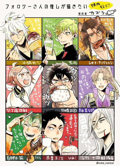 ありがとうございました! リクエスト募集した時点で 焼き肉食べさせようとは思ってたんだけど、 浮竹隊長のリクエストをもらった時点で 良いオチになってしまうことになってしまったんだ・・・。 今回は手癖の塗りで描いたけど、どっちがいいんだろう。 #フォロワーさんの推しが描きたい