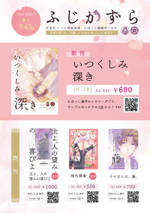 12/18【COMIC CITY SPARK 17 閃華の刻40 -年納-】 いろはにほへし13/南4 り43a「ふじかずら」 よろしくお願いします!! 【新刊案内】いつくしみ深き/A5 52P¥600 pixiv.net/artworks/10361… 【書店委託とらのあな様】 ec.toranoana.jp/joshi_r/ec/ite… 【書店委託フロマージュ様】 melonbooks.co.jp/fromagee/detai…