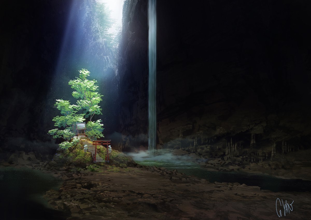 12 101 「幻のほこら」 美術設定に色を付けた感じ。 アニメだと水面は撮影さんが処理を入れるためにbookわけします。 #背景美術 #風景画 #イラスト #painting 21/01/29 23:50
