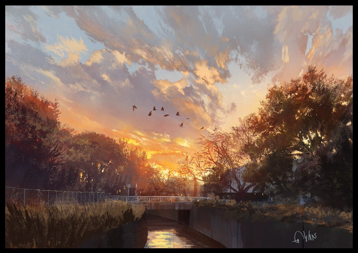 近所を散歩中にみた景色です。 川辺はいいね。 #背景美術 #風景画 #イラスト #painting