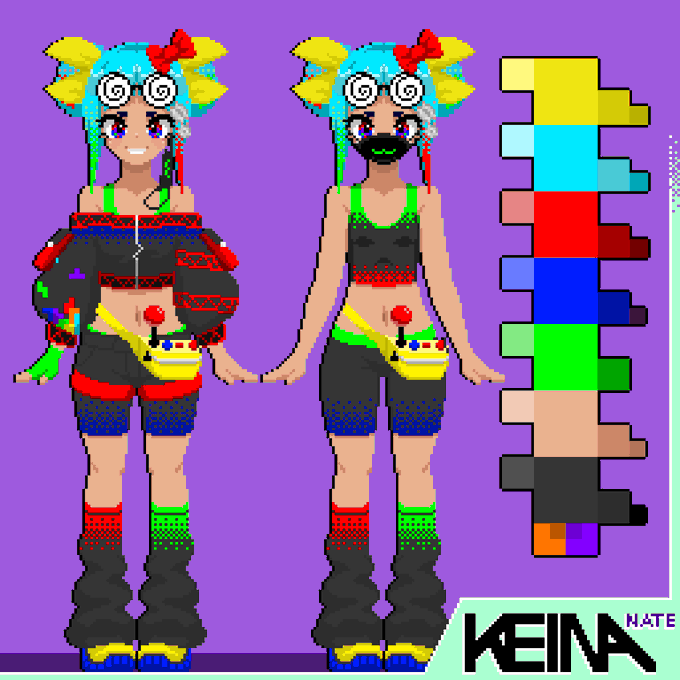 Ayo new classic arcade themed #Pixeltuber dropped! Designed by Chat and I, she'll be getting rigged and put up for sale next month. I'm still pretty amateurish when it comes to character design but I ADORE this design so I hope she finds a good home. #Vtuber #PixelArt