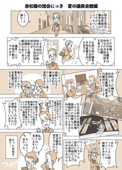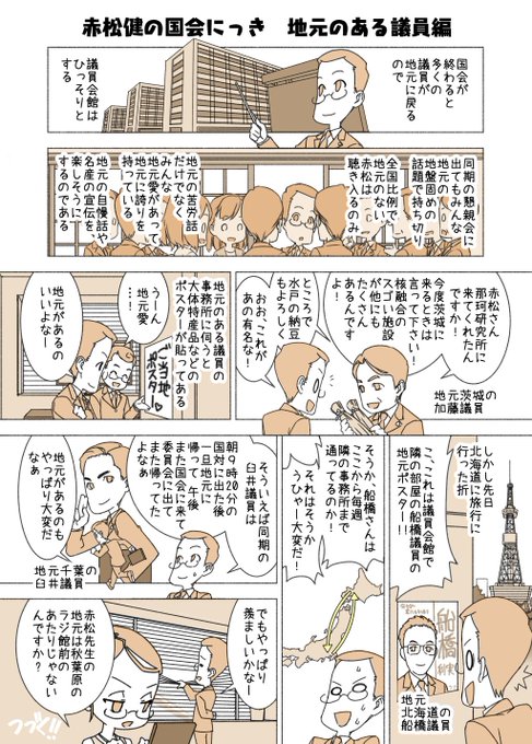 #赤松健の国会にっき (月・水・金曜に更新中) (155)夏の議員会館 編 2コマ目の「全国比例の議員」というのは参議院での一例で、衆議院では事情が異なります。また衆院議員の(現行憲法下の)平均在職日数は約2年10カ月だそうで、本当に大変だと思います。