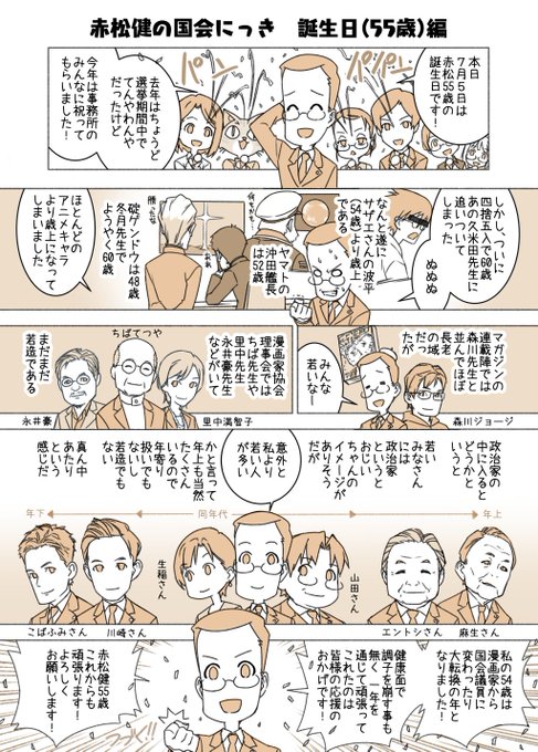 #赤松健の国会にっき (月・水・金曜に更新中) (140)誕生日(55歳) 編 本日7月5日は、私の誕生日です。何と55歳になりました。沖田艦長は52歳という設定でしたが、さすがに若すぎたのか、ヤマト2199では57歳に変更された模様。それでも若いよ!