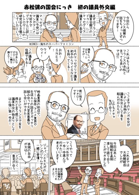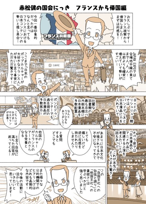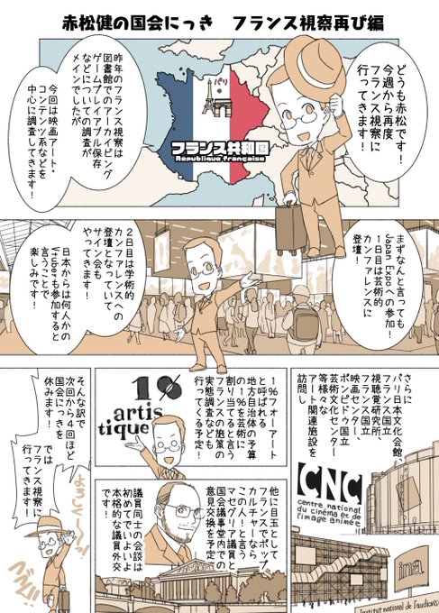 #赤松健の国会にっき (月・水・金曜に更新中) (142)フランス視察再び 編 昨年に引き続き、フランス視察に行ってきます!✈ 今回のメインは「Japan Expo 2023」の公式ゲスト(2日間)で、他にもアートやコンテンツ系の施設を訪問予定。帰国まで「国会にっき」はお休みします🙇