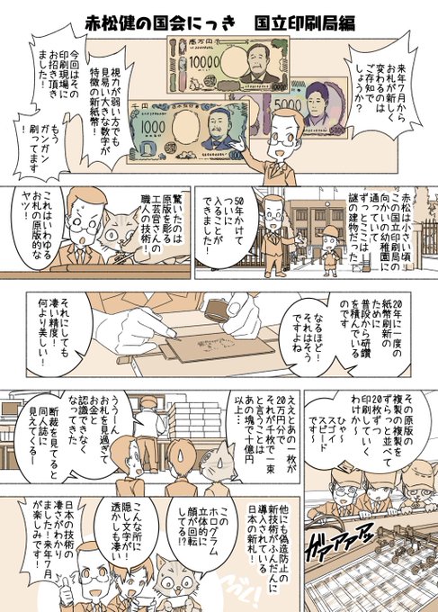 #赤松健の国会にっき (月・水・金曜に更新中) (148)国立印刷局 編 印刷局はホンモノのお金(紙幣)を刷っている施設で、警備は非常に厳重です。とにかく原版を彫る工芸官の職人技が凄すぎ!美大を出て十年単位で技術を磨き、自分の彫った紙幣が国民に使われる気持ちはどんな感じなのでしょう。