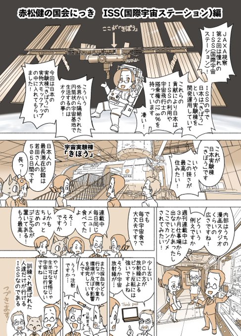 #赤松健の国会にっき (月・水・金曜に更新中) (151)ISS(国際宇宙ステーション)編 ISSの内部にいても、宇宙放射線を完全に遮断することはできません。なので滞在時間は制限されており、健康管理も厳重です。また微小重力では骨量の減少や筋の萎縮などもあるそうで、やはり宇宙飛行士は大変!😱