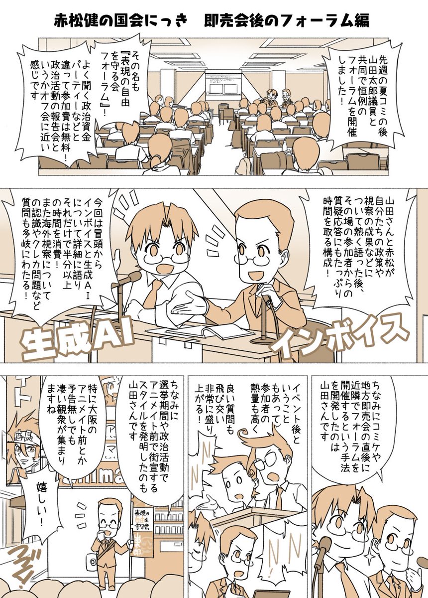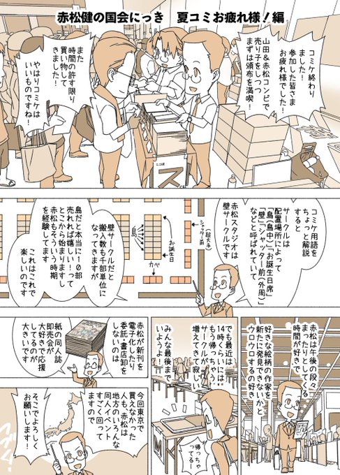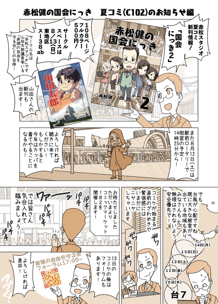 #赤松健の国会にっき (月・水・金曜に更新中) (152)夏コミ(C102)のお知らせ 編 コミケ出ます!🥳初日は街宣のみ。二日目はサークル参加で、山田議員と合体(東ス-38ab)。新刊は『国会にっき(第2巻)』。既刊もあり。大量搬入して閉会16時までいる予定。ぜひ来て!夕方にはフォーラムやります。