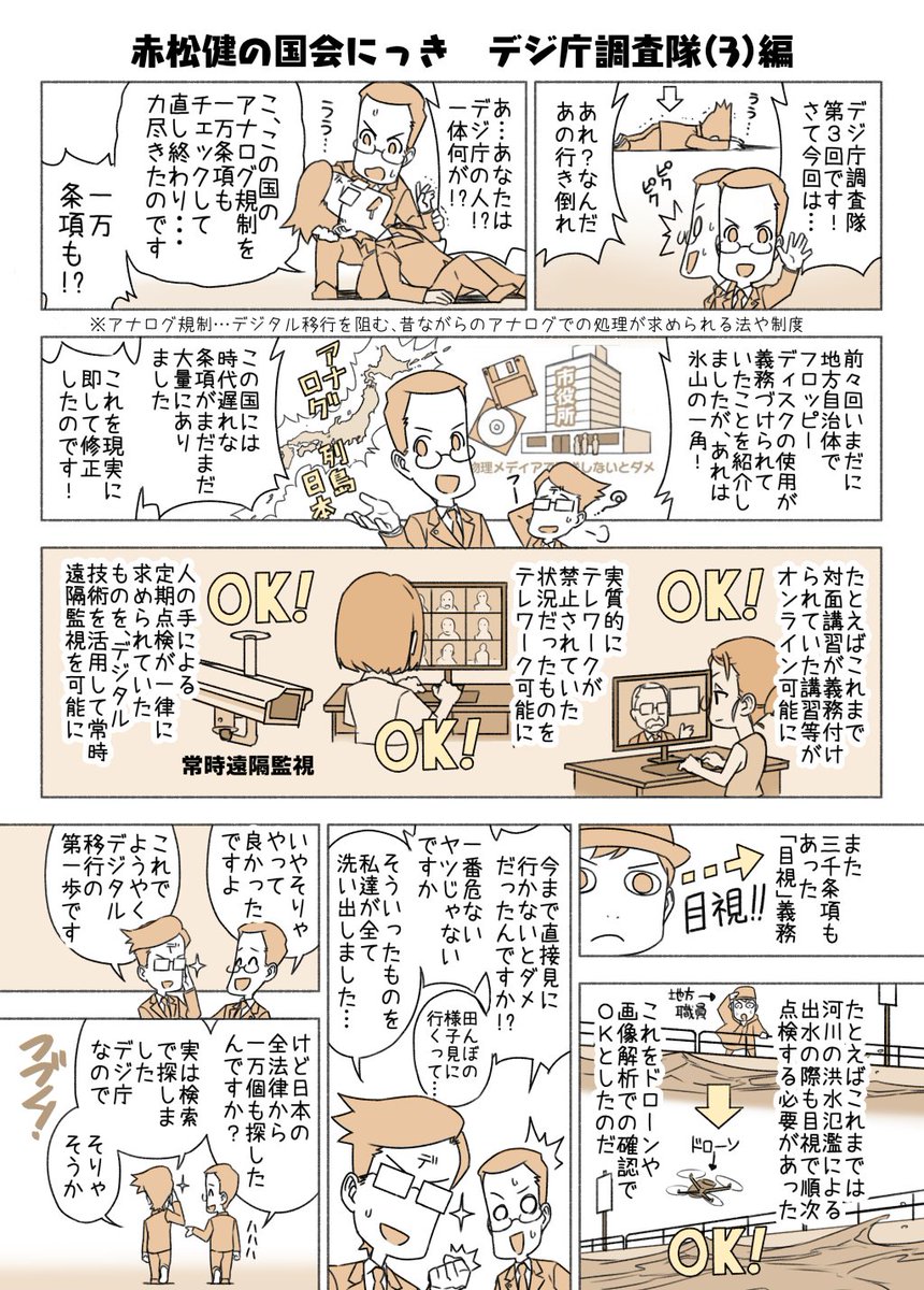 #赤松健の国会にっき (月・水・金曜に更新中) (157)デジ庁調査隊(3) 編 台風の時に「河川の様子を見てくる」と言って外出するシーン。実は目視規制という「人が現地に赴き一定期間常時注目することを求める」アナログ規制がありまして、それだったのかも?!デジ庁により一気に修正されました!