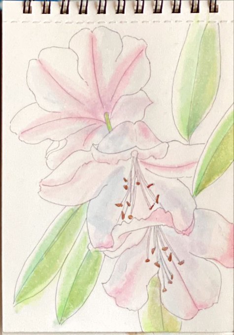 0 1 #植物画 #水彩 #絵手紙 #絵画 #アート #art #絵が好きな人と繋がりたい #ピンクのツツジ 先日出掛けた庭園に咲いてたツツジ 淡いピンクのグラデーションがとても綺麗だったな。 22/05/11 08:33