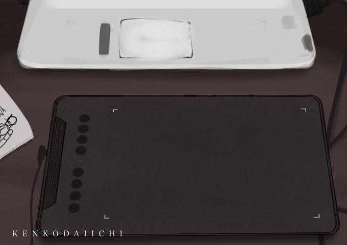 #イラスト #絵描きさんフォロバ100 #絵柄が好みって人にフォローされたい #イラスト好きな人と繋がりたい #春の創作クラスタフォロー祭り 【自分の使っている機材を描いてみた】 板タブ【Deco01】、それとノートパソコンだよ〜 構造とかは紙で描いてる! 上手く描けてるかな👍