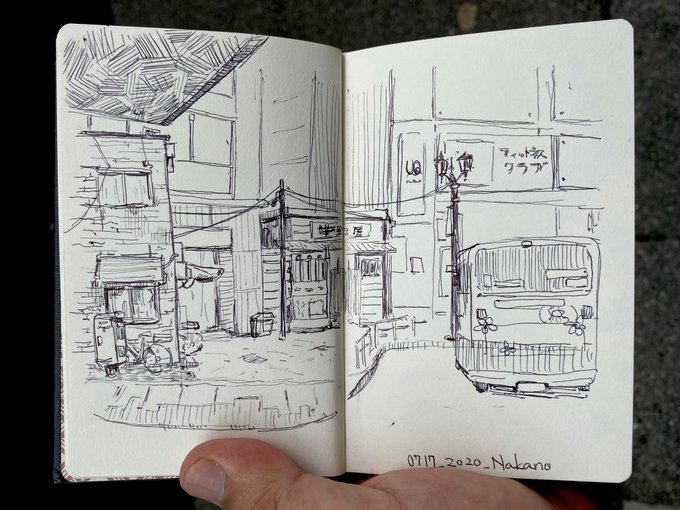 普段持ち歩く用のスケッチブックはずっとMoleskineだったんだけど、最近Tonko Houseスケッチブックに変えてみた。 これはイイ、、サイズが小さい分持ち歩きも楽だし、立って描いてても軽いから手が疲れない。紙もめちゃいい! #ウォーキングスケッチ #トン活