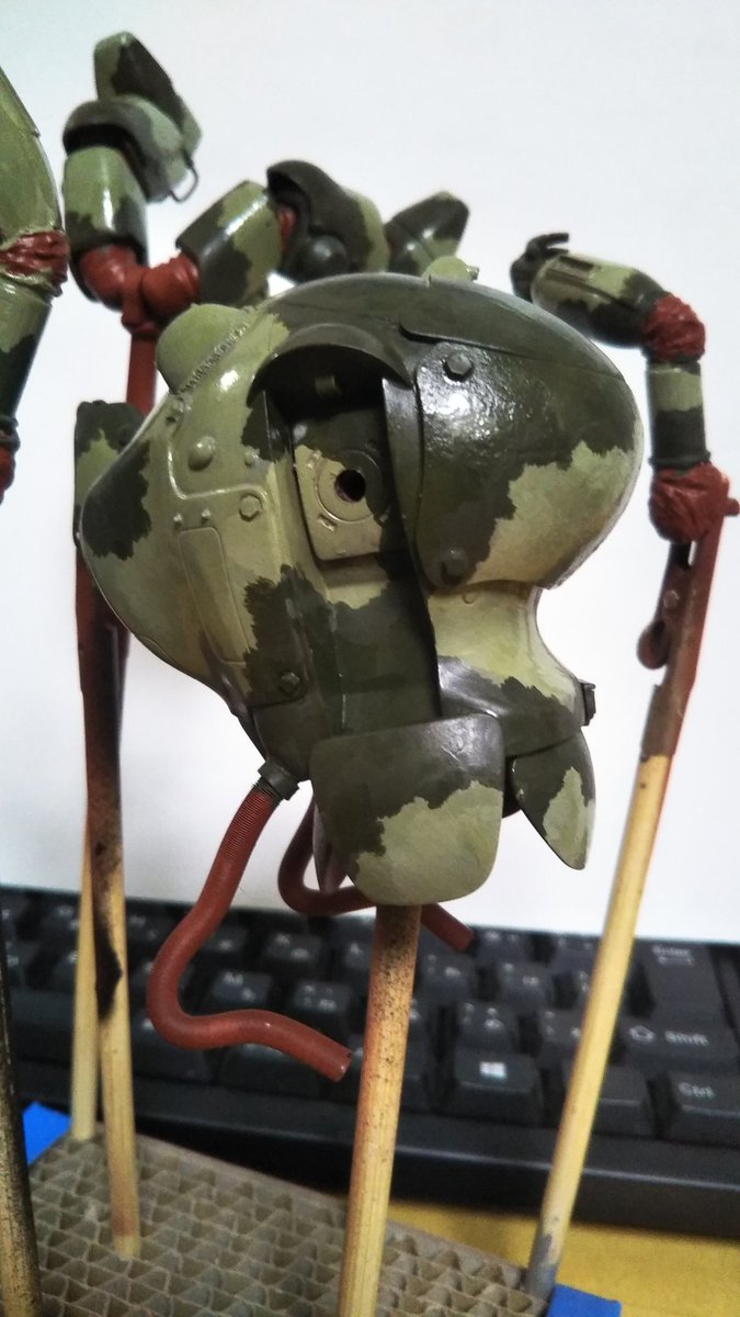 今夜のバウンドドック 墨入れはスモークをビシャーと塗ってます 侘び寂び感ある(*´∀`*) 眼と唇にクリアーしました #ガンプラ #ガンプラの画像貼るとRTされると聞いて #ガンプラはどんな自由な発想で作ってもいいんだ #プラモデルを楽しんでおります