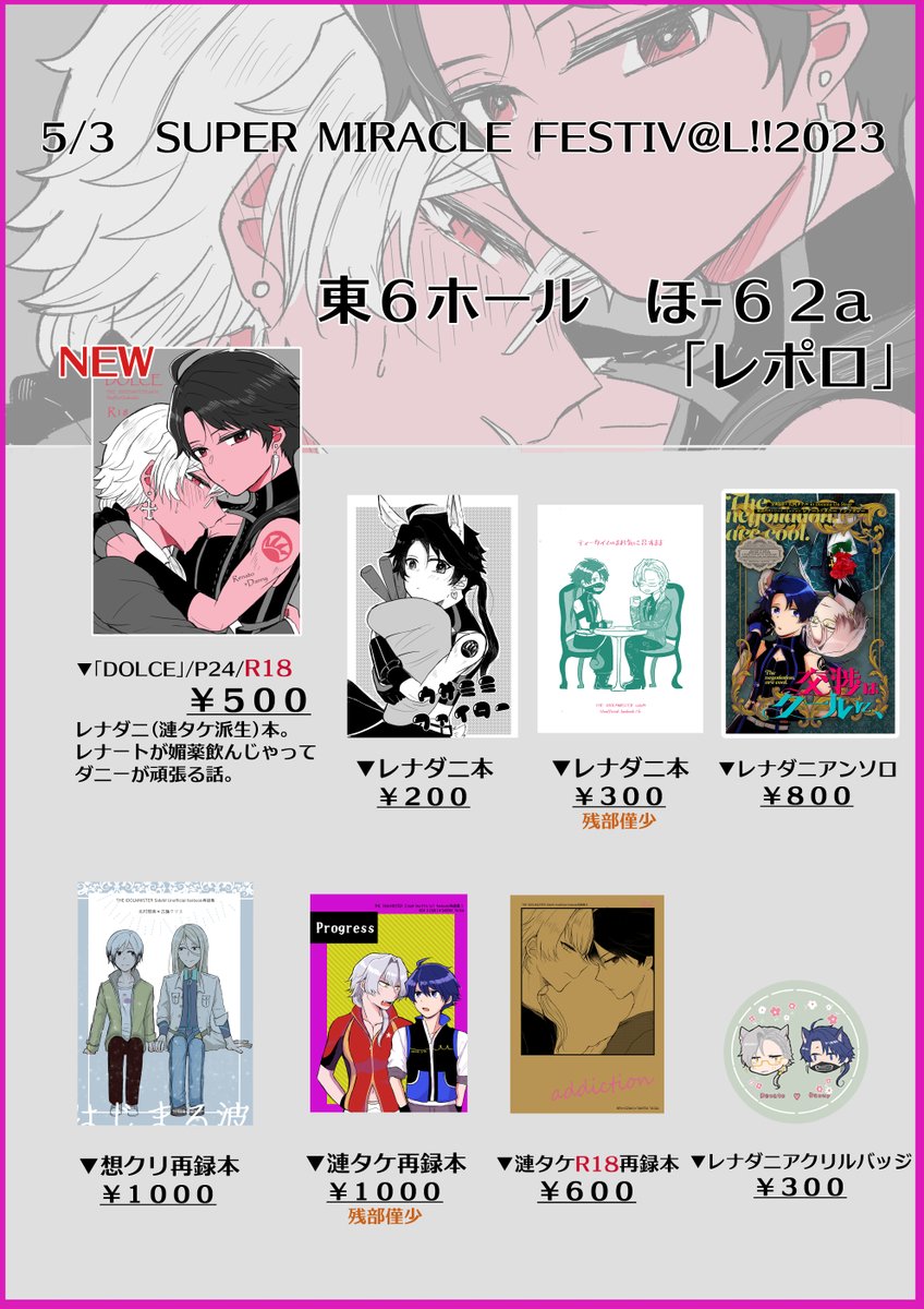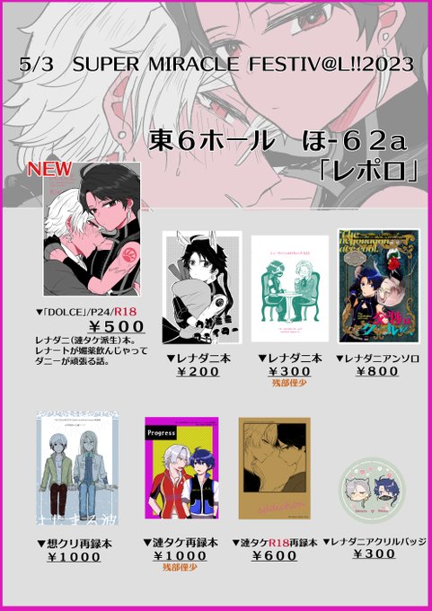 5/3ミラフェスのお品書きです~!よろしくお願いします! 残部僅少のものもあります~アクリルバッジは今回で頒布終了しようかと思ってます。 イベント後通販はフロマさんとらさんに委託予定です。 |pixiv.net/artworks/10760…