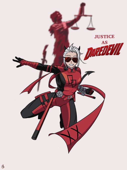 There is a blind character, the color is usually black and red, active in places related to hell, and this character's career is related to the law... So this character is... #Helltaker #Helltakerfanart