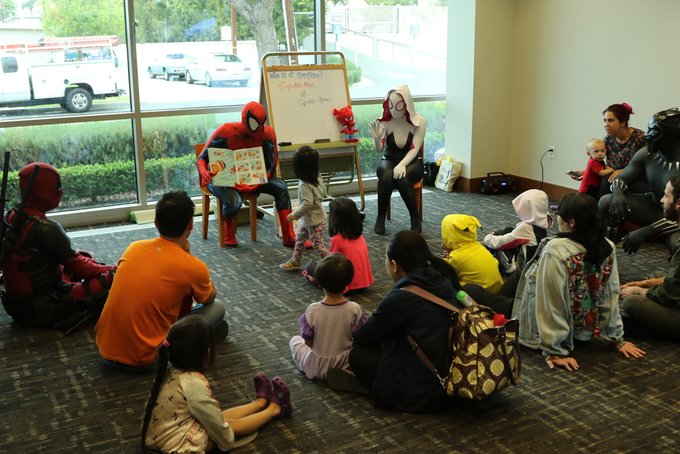 Books help bring imagination to life in the minds of children. We had so much fun helping out at the orange county library📸 What books are you reading during quarantine? Let us know in the comments. #spiderman #kidscancosplay #books #reading #cosplay @ColtonJUSD #library