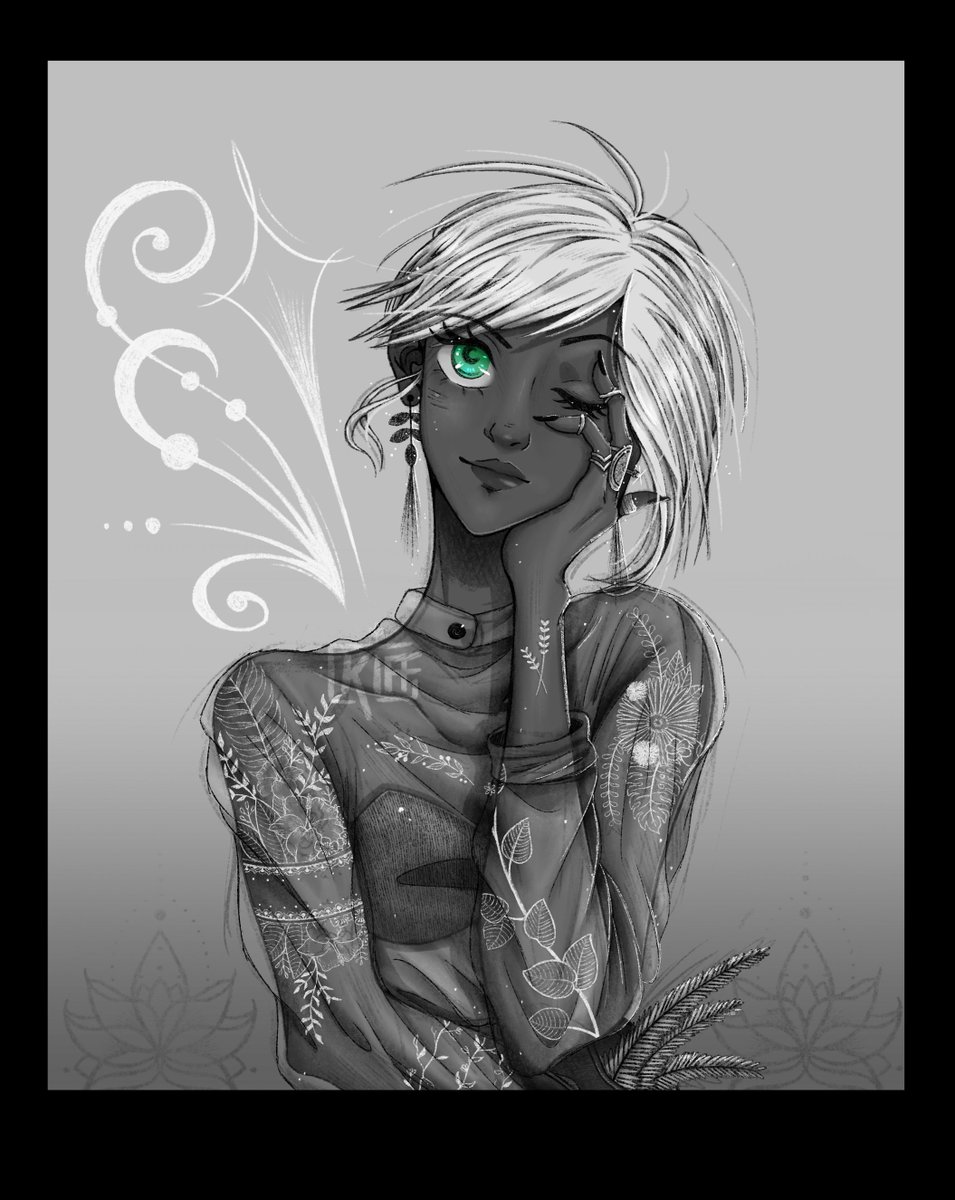 It’s been some time since I wanted to try the concept of dark skin and white tattoos, so here you have my #2 witch, Zalie 🌱 #inktober #inktober2019 #witch #girl #characterdesign #aesthetics #greyscale #blackandwhite #art #ArtistOnTwitter #plants #tattoo #procreate #digitalart