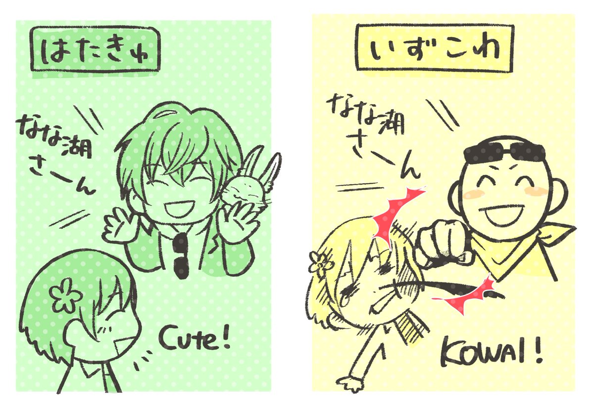 4/13 高田村 なな湖さん視点 💐「はたさこはキュート。Isさんは…こわい。ニコニコしながらぶん殴ってきそう」😂 #なな湖大好きちゅちゅアモアス #はたアート #いずにこあーと