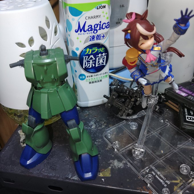 HG旧ザク 合わせ目処理、仮組完了 旧ザクのいいところは付属武装が多い せっかくだからトウカイテイオーさんにも持たせてみた。( ・ω・) #ガンプラ #ガンプラ好きな人と繋がりたい #ガンプラの画像貼るとRTされると聞いて #ガンプラ初心者