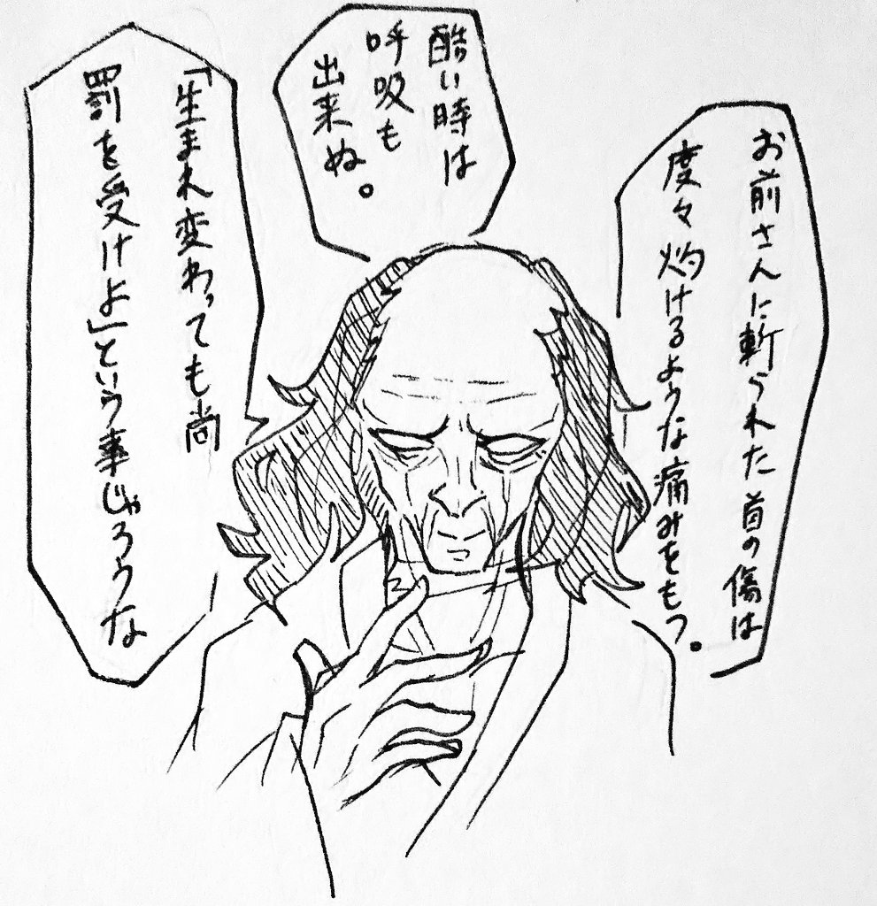 首の傷について深堀りしたくなった妄想1000%落書き。 オール怯おじいちゃん。 ※喜怒哀楽憎じゃないよ! twitter.com/KinKan_Shiranu…