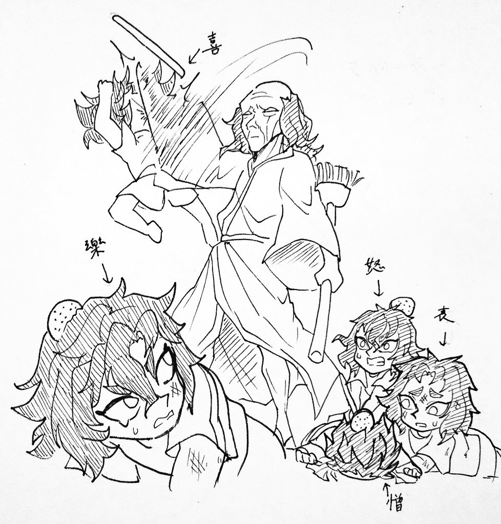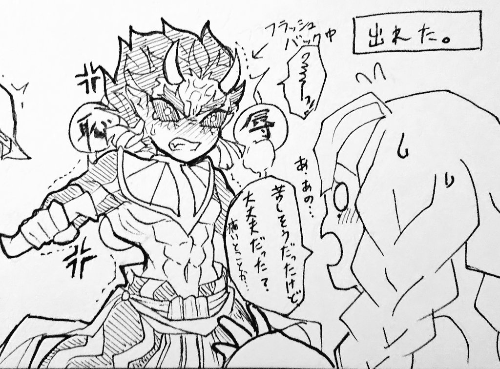 14 129 首の傷について深堀りしたくなった妄想1000%落書き。 オール怯おじいちゃん。 ※喜怒哀楽憎じゃないよ! twitter.com/KinKan_Shiranu… 23/07/14 22:35