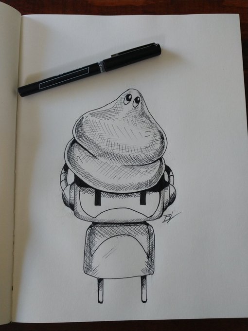 #Inktober day 15 & 16. A combo drawing since I forgot yesterday. Had a lot going on but managed to sneak in 15 minutes today to sketch & decompress. Marshmacaron bring carried by Appliancer Socketroll. I imagine these two would be buddies if they ever met.
