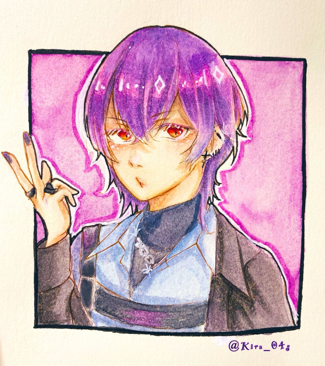 新衣装のなかっすくん🍆 (髪型、服装、アクセサリーまで全てが好みでした。かっこいい(*ˊᵕˋ* )) #茄子画 #コピック #水彩