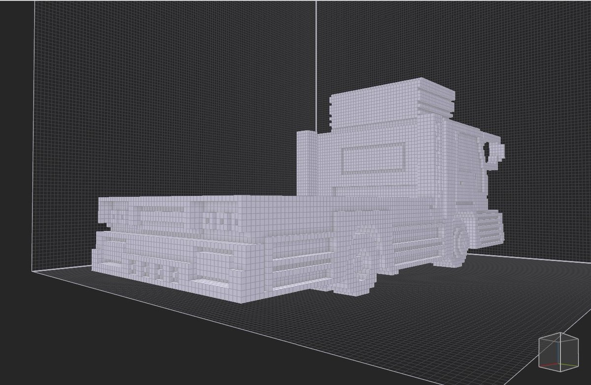 🐻< #voxelart でデコトラ出来たよー✌️ モチーフは2トン箱車クラス。(箱は後載せ用) 後輪ダブルタイヤ仕様で一応表から見える腹下は作ったけどこの辺はTheSandboxに出す段階でもう少し作り込みます。 娘が寝たら軽く色のせてみる予定! voxelクルマ界隈の覇権取れるように頑張るぞい💪 #magicavoxel