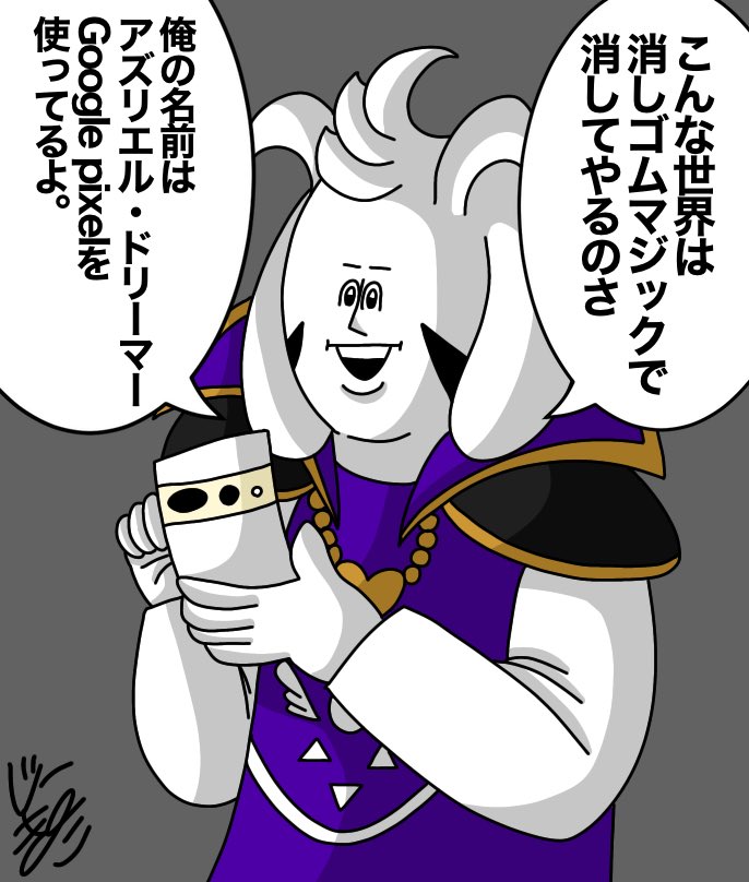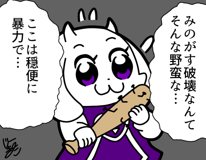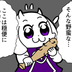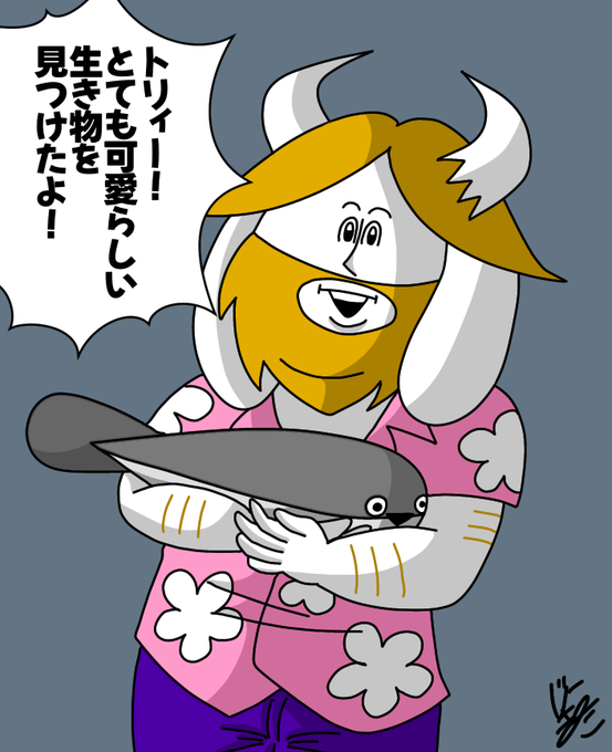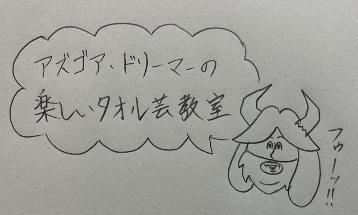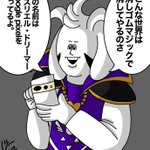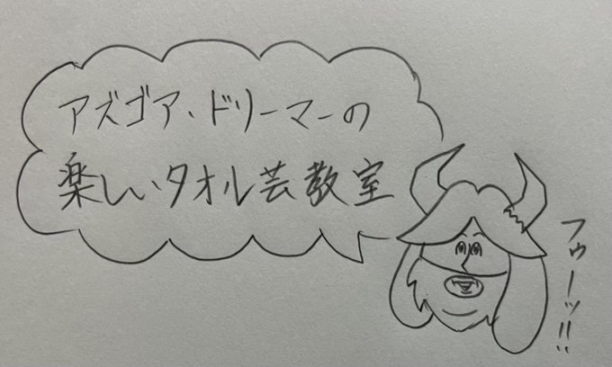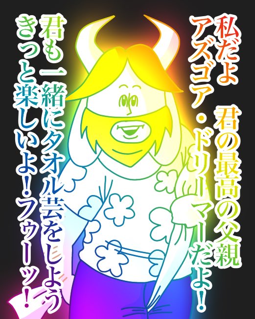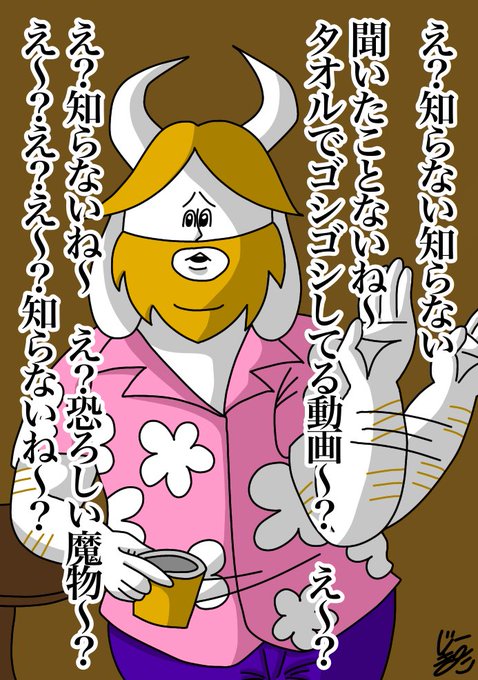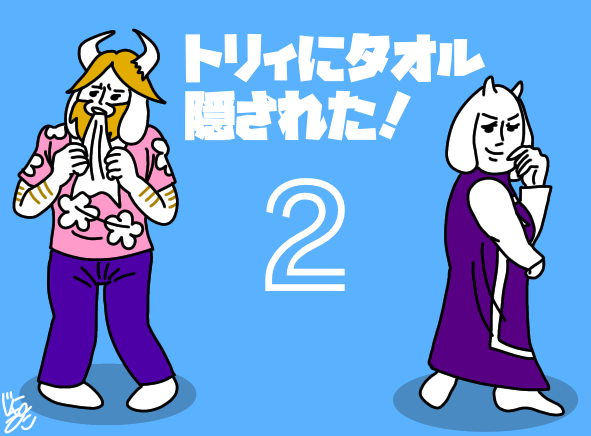アズリエル、今日から「タオルゴシゴシ」をするんだ。 「タオルゴシゴシ」をする事で強いモンスターになれるんだよ。パパは強いモンスターだ。だからタオルをゴシゴシするんだよ。 トリィ、キャラがタオルを捨てようとしている。捨てるのをやめさせなさい。 #undertale