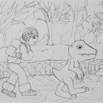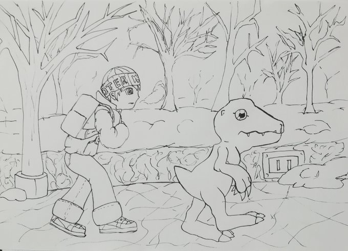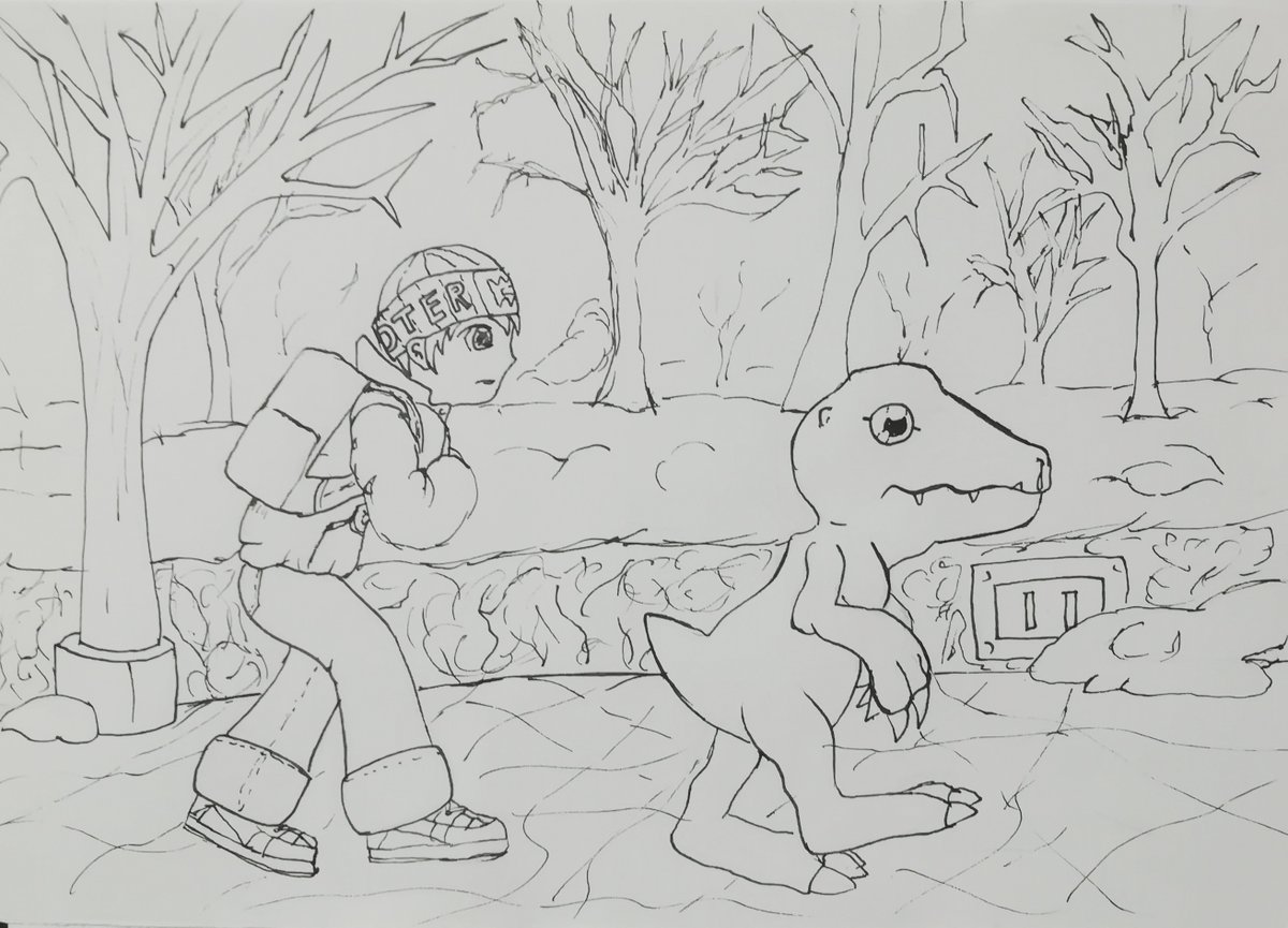 18.- Personaje de videojuego, Inadaptado Hiro, Agumon, Digimon World #digimonworld #hiro #agumon #frio #cold #videogames #playstation #freezeland #snow #mistif #Digimonth #inktober #inktober2019 #digimon #diginktober #tinta #ink #practica #sketch #sketchbook #drawing #drawings