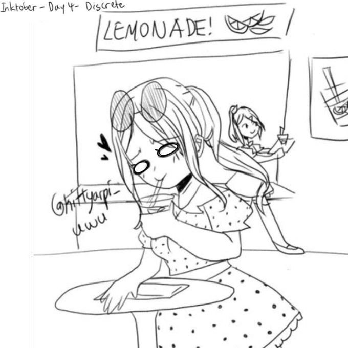 Inktober: Day 4: Discrete I had a lot of fun drawing this and I think it looks cute qwq- I drew my lemonade shop OCs because I haven't draw them in a while, and they look cute. ~w~ Damn, she's drinks so discreetly- XD #inktober2020day4 #inktober #inktoberday4