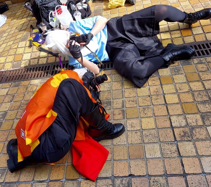 Sky~カメラに本気の子どもたち~ 傾斜を利用するミミズク@Nakki_cos_ 関節イカれ楽園 @Kiu_hobby それを撮った点燈夫 @nanotebafo #アコスタ池袋 #Skyコスプレ