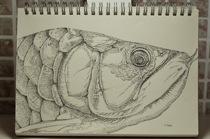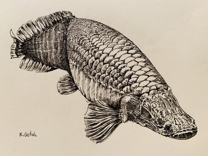 1 3 完成しました世界最大級の淡水魚 #ペン画 #drawing #ピラルク 23/03/04 08:19