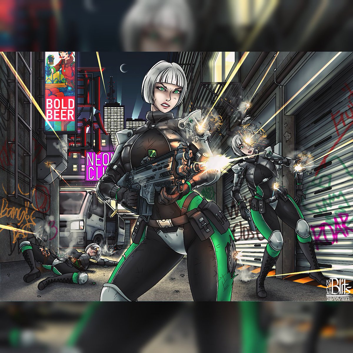 Black Viper Getaway Shootout (Commission) Commissioned by Erntoron - The Luana units had prepared for a quick escape. Just within reach of their vehicle where they met with sudden resistance, one that had been armed with anti-material weapons #drawing #digitalart #Commission
