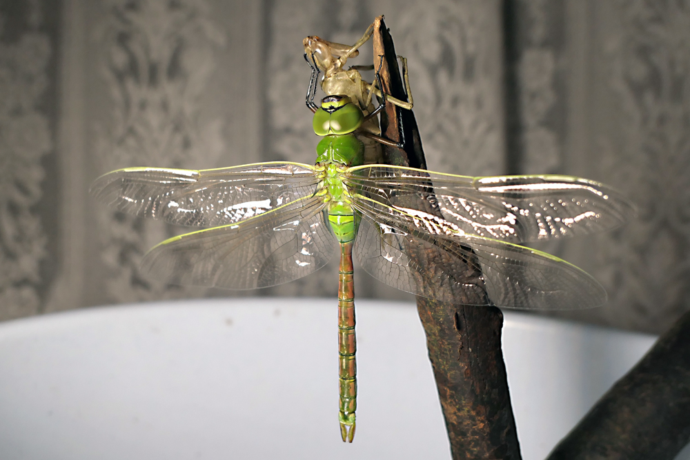 21 79 近所で捕ったギンヤンマのヤゴが羽化した。 腰が水色のがオス。黄緑だとメス。これは水色がまだ出てないオス。 23/06/12 21:09