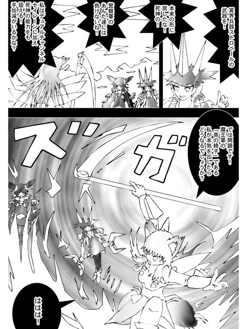 36 72 スペースセイレーンは攻撃用装備を展開した すなわちシーサーペントの尾が二尾 それに加え死神ストロベールから得た死神の鎌 それらで威嚇するも相手のムササビスは全く恐れる様子はない 腕を組み相手を睨みこう言った 「まだやるの?シーサーペントの尾だって?」 23/08/11 18:38