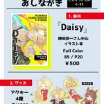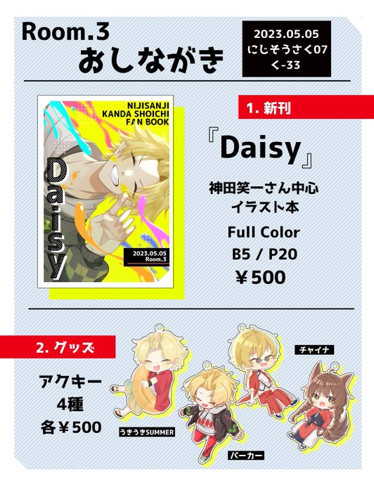 9 19 #にじそうさく07 【く-33】お品書きになります! イラスト本とアクキーを頒布する予定です。 イラスト本は神田くん中心に好きな組み合わせを盛り込みました。(チャイナと黒髪捏造あり) 2枚目がイラスト本のサンプルです。↓ 23/05/01 18:18
