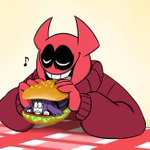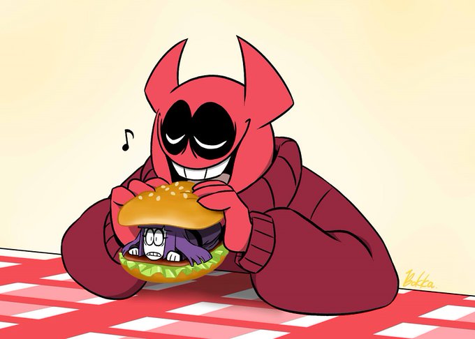 落書き。「ボブのランチタイム」 トムとジェリーのフィギュアのパロディ。 (※手とバーガーの位置トレスしてます) この後ボブは痛い目に遭い、Lilaさんは無事脱出します。 #spookymonth #spookymonth5 #bobvelseb #spookymonthfanart #SrPelo #TomandJerry