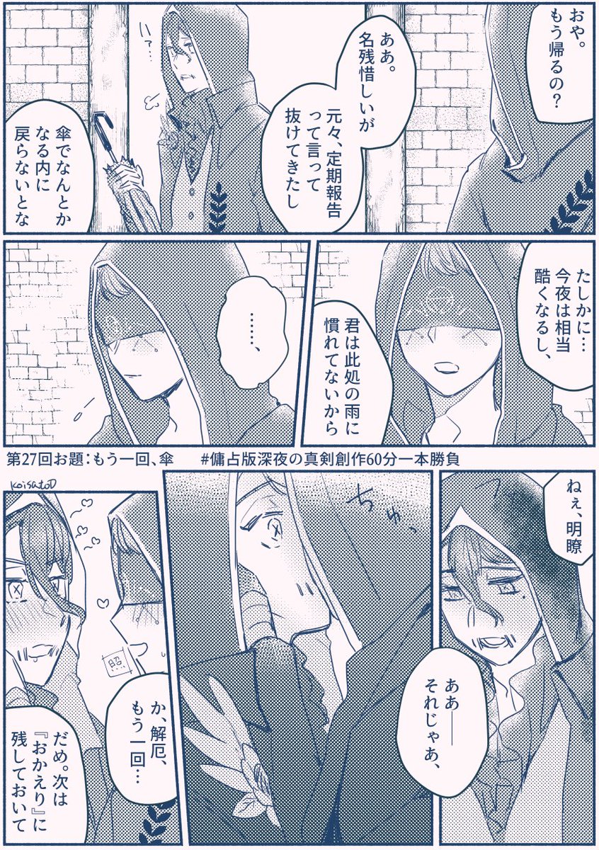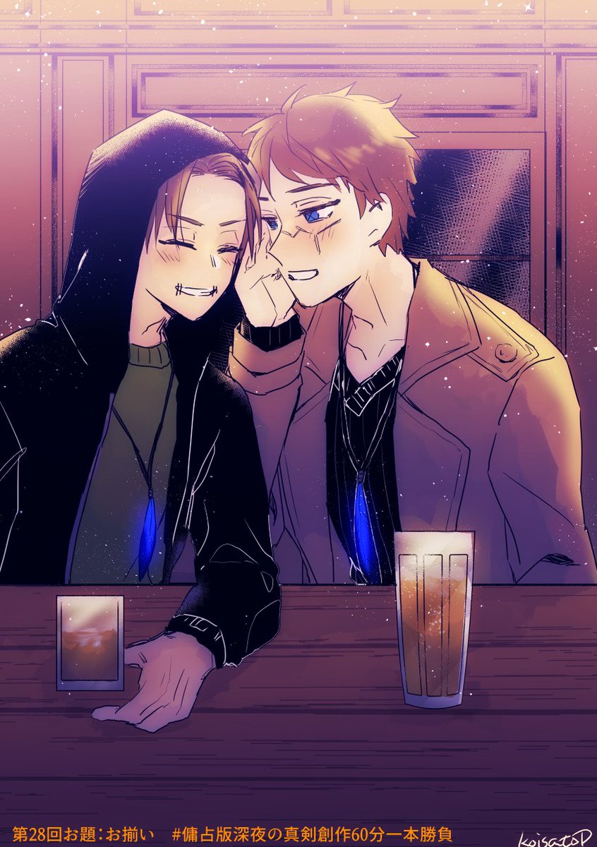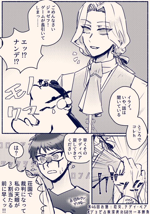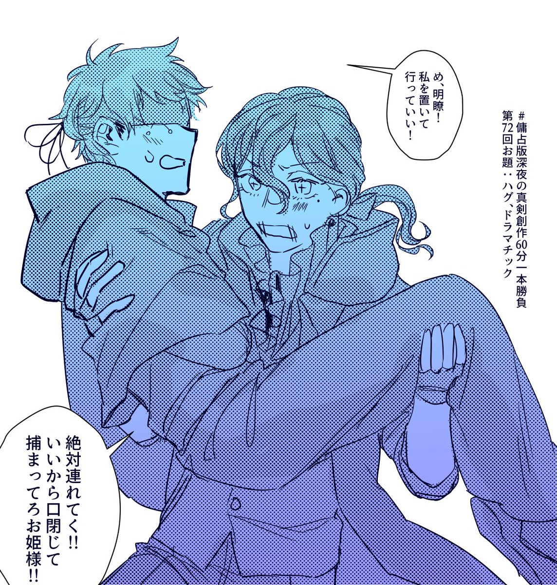 第24回 お題:心労 #傭占版深夜の真剣創作60分一本勝負 #NaibEli_1draw_night 「「だから早く逃げろ(て)」」 「……二人とも心労酷くなると同じこと言うんですよね。」「エミリー先生に叱ってもらわなくちゃ!」