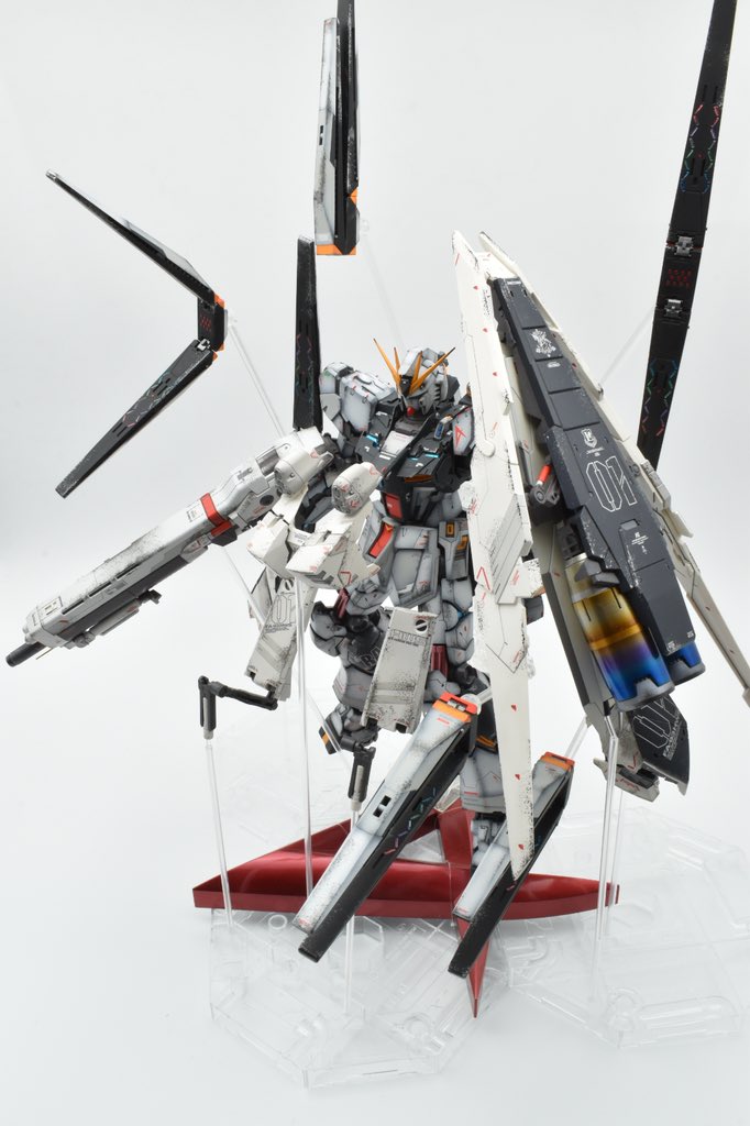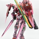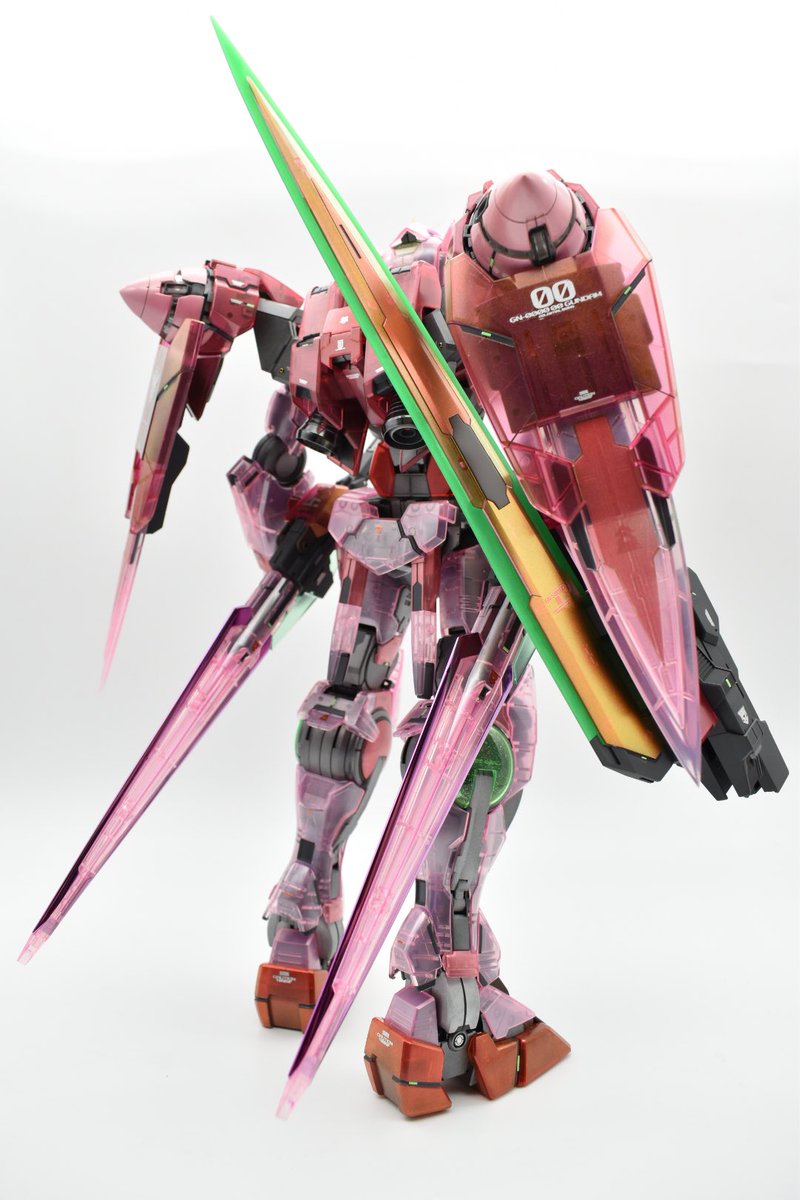 ダブルオー完成です 今回は筋彫り等の加工はせずに塗装に力を入れて作製しました(^^) クリアパーツとパールメタリックの両立で見る角度によって透けたり金属粒子の反射になったり見ていて飽きない作品になったと思います #ガンプラ #PGダブルオー #ガンプラの画像を貼るとRTされると聞いて
