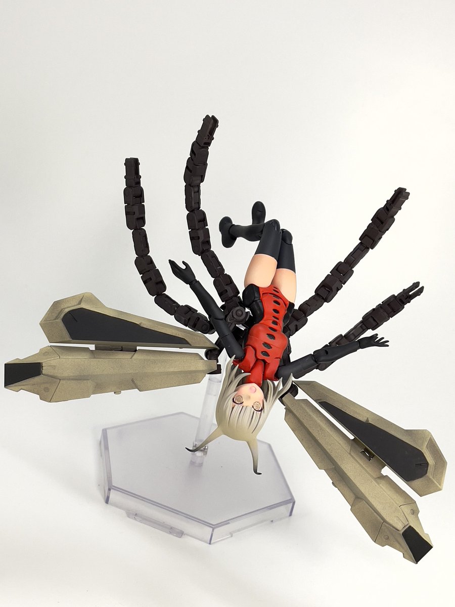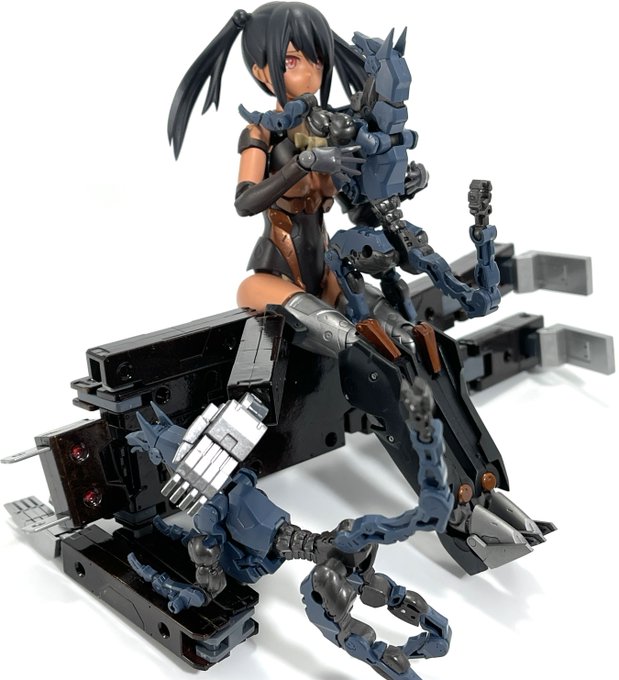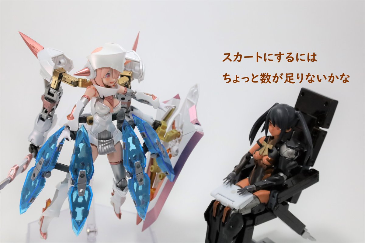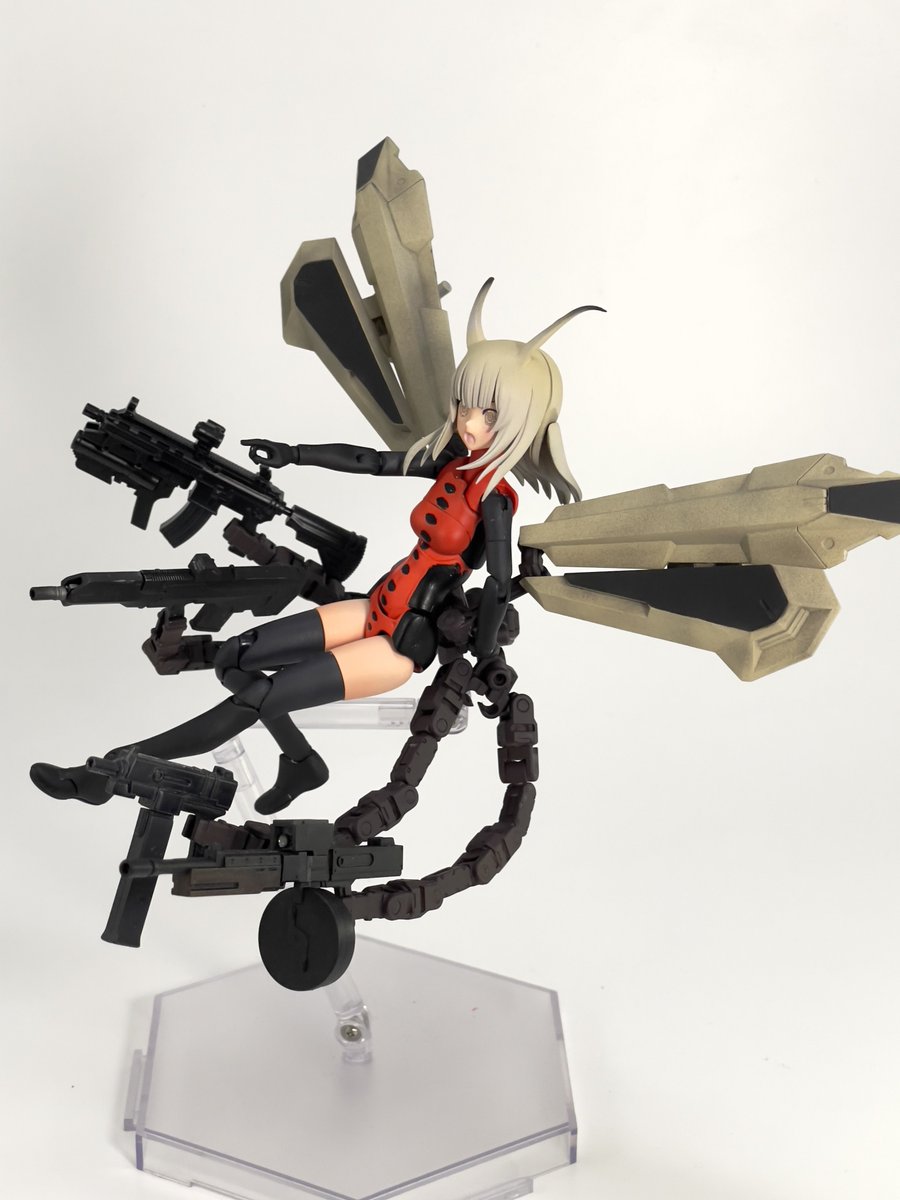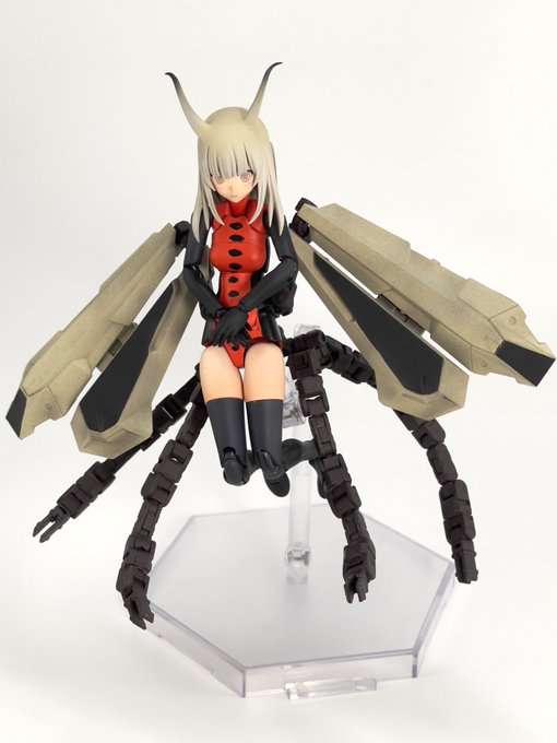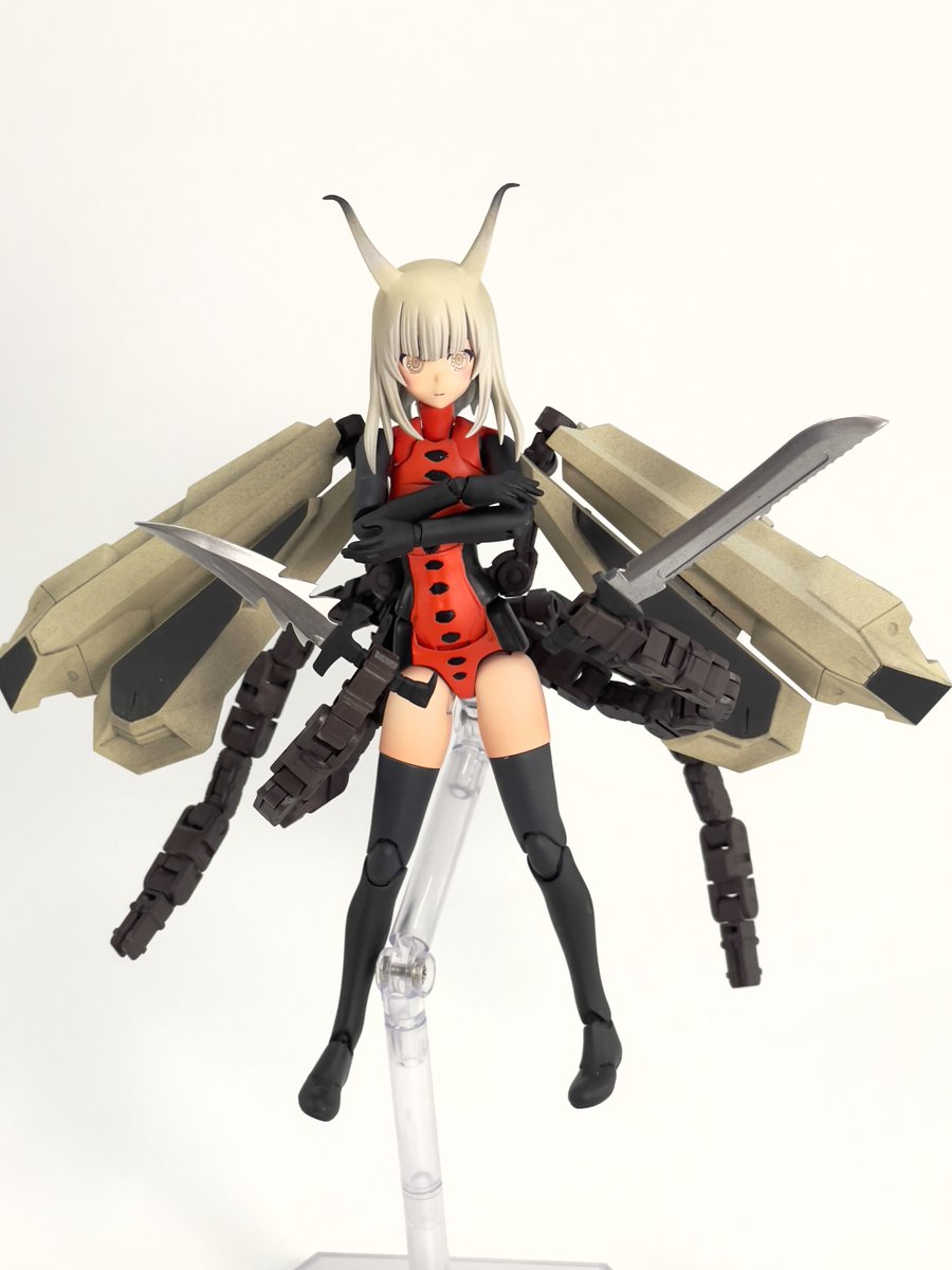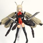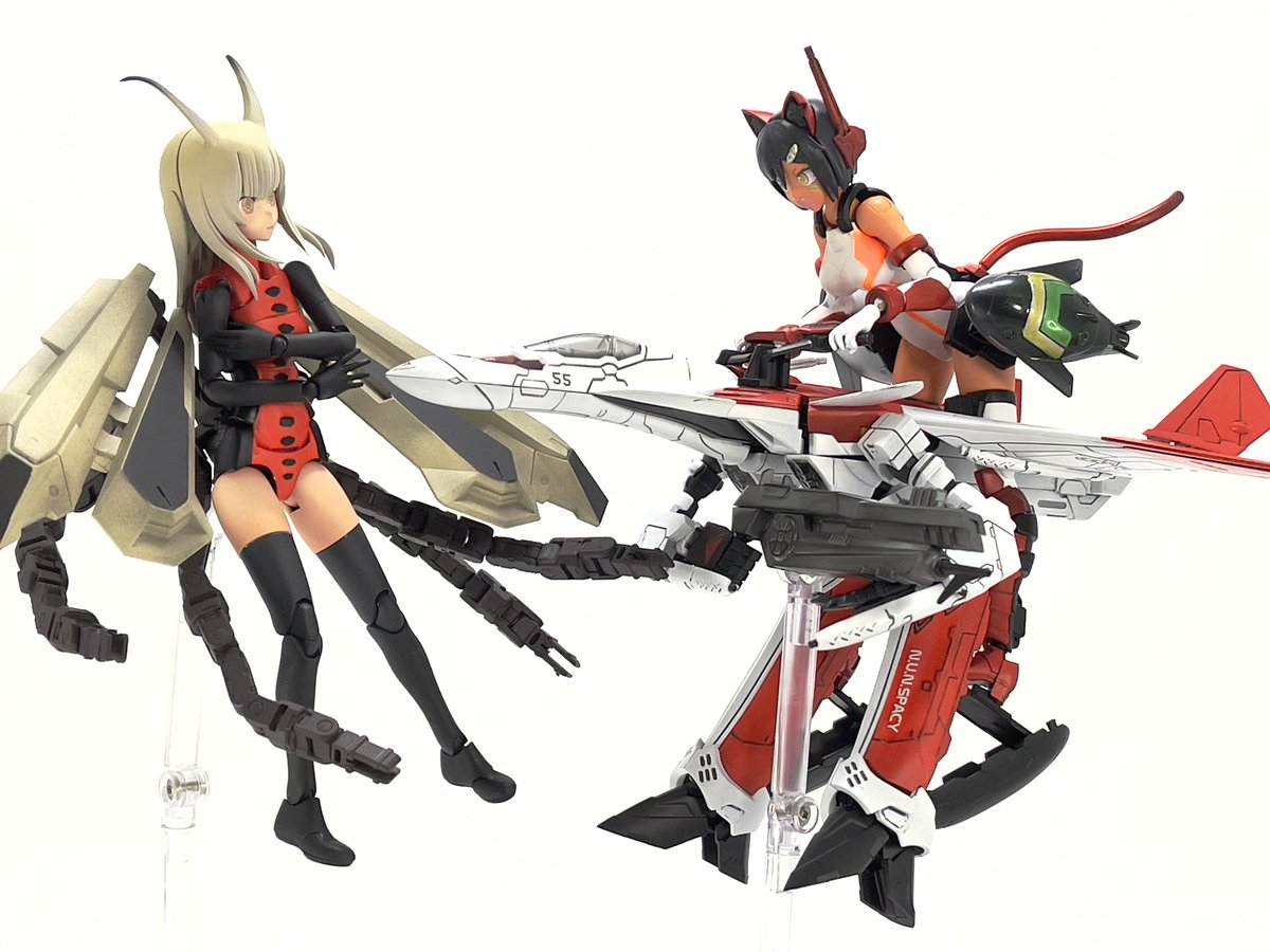#今月作ったプラモ晒そうぜ クロスジヒトリちゃんとVFガールスクルド 二人乗りさせてわかったのはVFガールはメガミデバイスと比べると足が長い気がする クロスジヒトリがわからなくてググる人はやばい見た目の虫が出てくるから注意