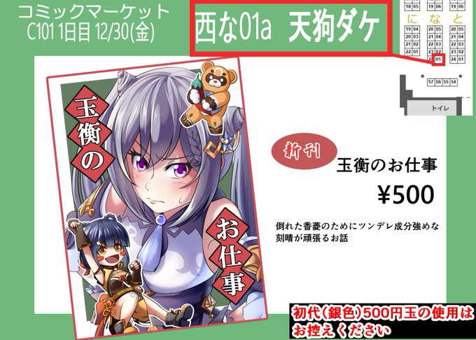 あなたのサークル「天狗ダケ」は、コミックマーケット101で「金曜日西地区 "な " 01a」に配置されました!コミケWebカタログにてスペース配置場所公開中です! webcatalog.circle.ms/Circle/Map/168… #C101WebCatalog 改めて~冬コミC101サークルスペース貰いました! 今回は原神刻星本の予定です!誕生日席!!