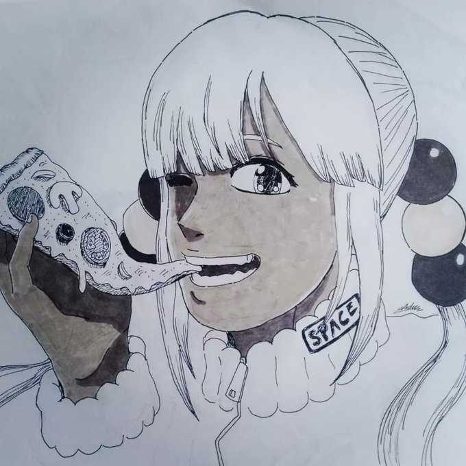 Made this drawing after I listened to Sana's Twitter Space eating pizza, really took my time finishing it and despite some details I mostly liked the result. PD: I forgot to draw her size limiter so let's assume she's having a planetary sized slice of pizza :'D #galaxillust