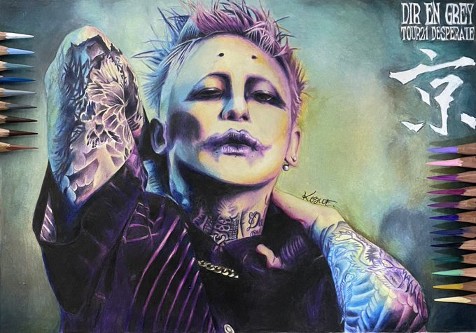 𝐃𝐈𝐑 𝐄𝐍 𝐆𝐑𝐄𝐘 色鉛筆画、𝟐𝟗枚目です 写真集『失格弐』より ダーク系が続いたので、明るくカラフルで楽しかったです 日数だと8日、苦戦もあったけど 早かったです ❤️&RT♻️&フォローして頂けたら 嬉しいです😊 #DIRENGREY #京 #色鉛筆画 #タトゥー #拡散希望RTお願いします