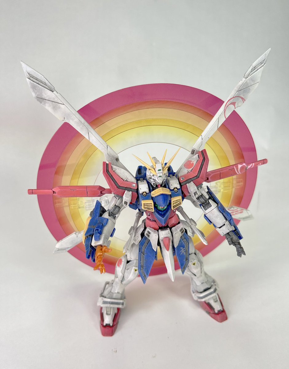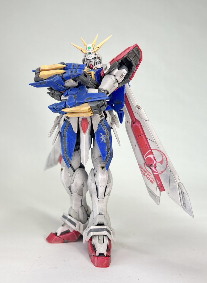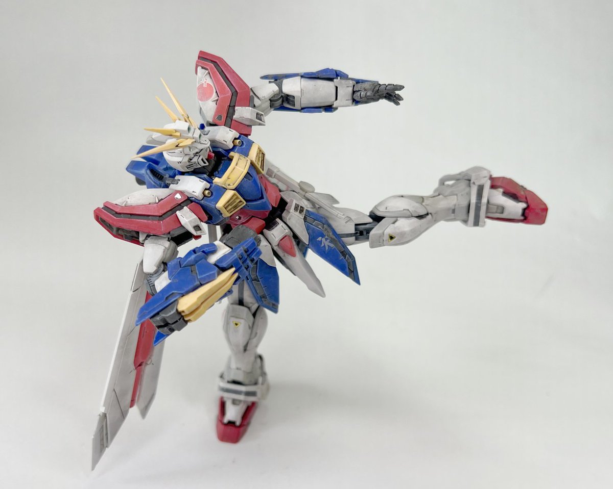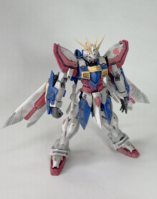 バンダイRG ゴッドガンダムです ギアナ高地で修行して香港に帰ってきたイメージで作りました 太ももや上腕、腹部を幅増しして少しマッチョに ツノをシャープに尖らせて9パーツだけ塗装して あとはウェザリングして仕上げました GOD GUNDAM paint and build #ガンプラ #ガンプラ好きとつながりたい