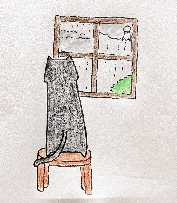 雨 #アナログ #イラスト #猫 #ペン #色鉛筆