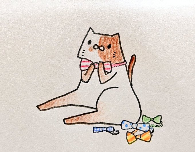蝶ネクタイ #アナログ #イラスト #猫 #ペン #色鉛筆