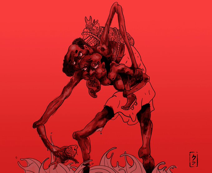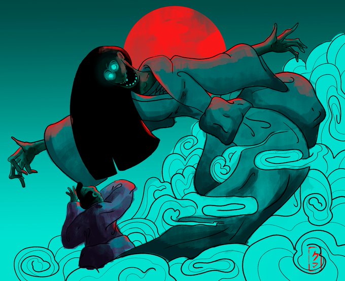 Inktober dia 20: Ashinaga-Tenaga Son dos yokais que viajan en pareja, uno tiene los brazos muy largos y el otro las piernas. Se suele ver en las orillas de los ríos, uno subido a las espaldas del otro y aprovechan sus extremidades para pescar. #yokai #inktober #ashinagatenaga