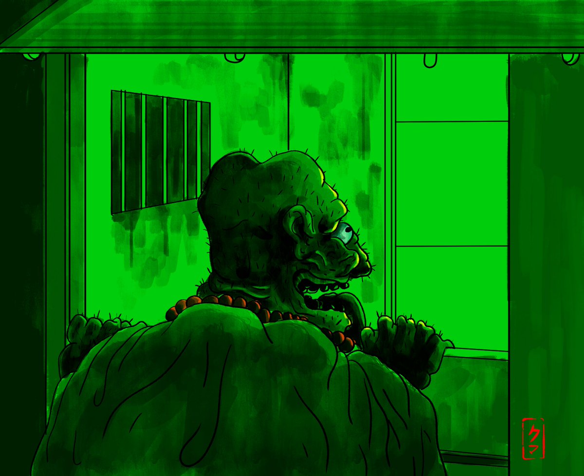 Inktober dia 23: Kanbari Nyūdō Un yokai fantasmal con apariencia de monje recubierto de pelos gruesos que espía en los baños en la noche de año nuevo. #yokai #inktober #kanbarinyudo